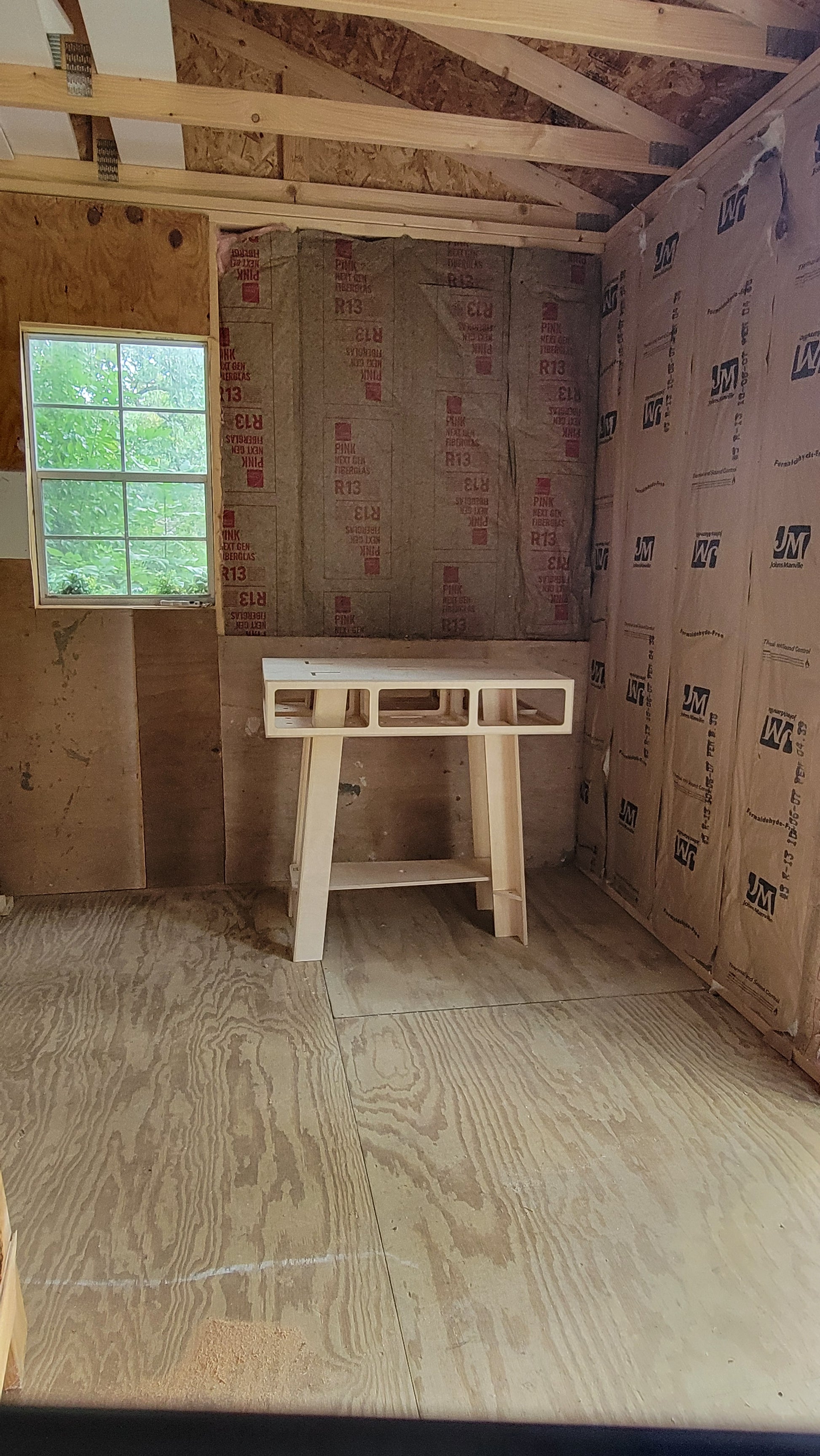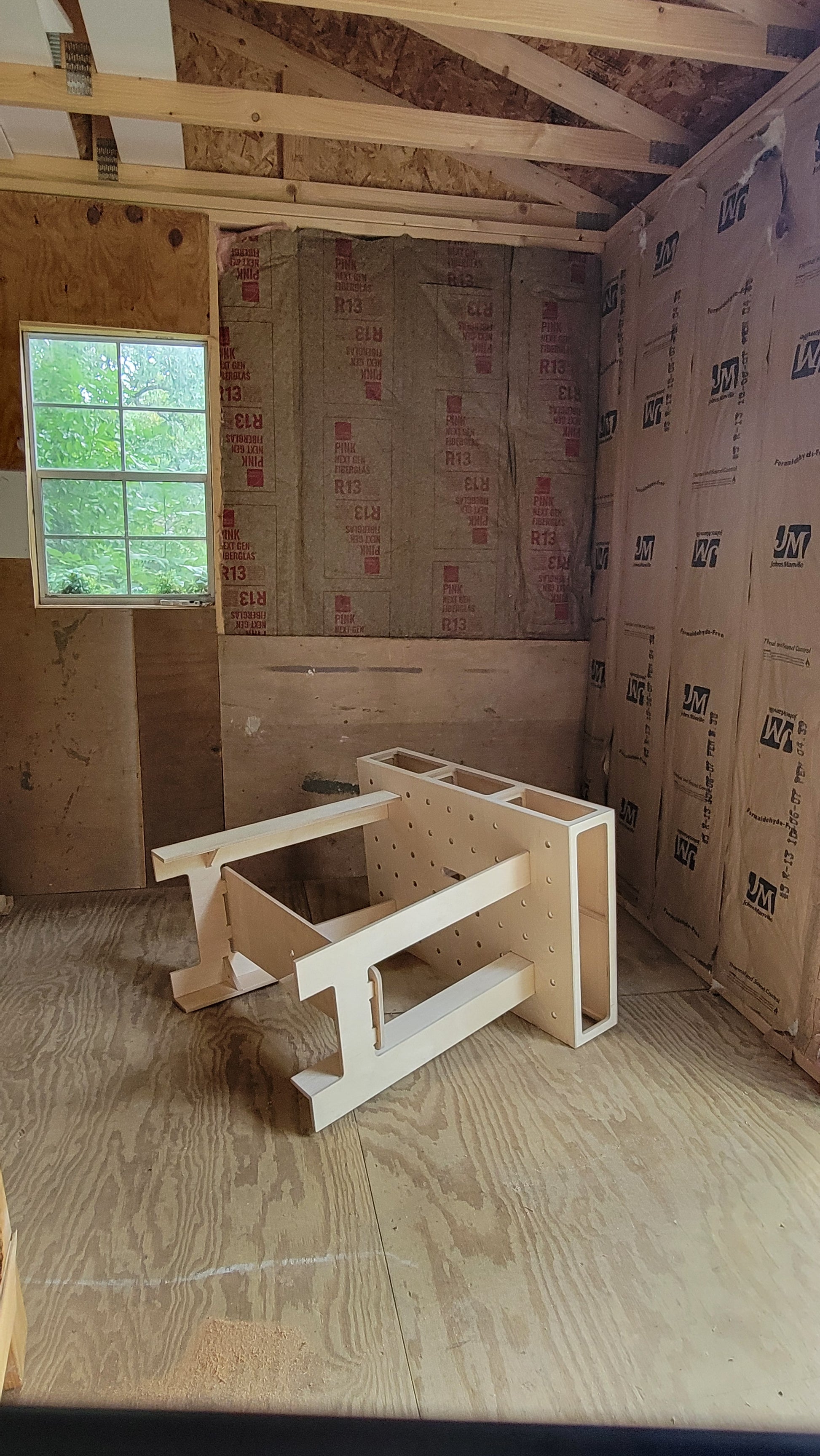 This workbench is ideal for a variety of projects including woodworking, crafting, assembly, and more. Its portable design allows you to take it wherever you need it, whether it's your garage, workshop, or even on-site for a job. Assembled 2'x3'x35" Collapses to 2'x3'x6" for easy storage and transport; weighs 35 lbs Torsion box ensures a rigid and stable work surface even under heavy use. Angled legs provide additional stability and prevent wobbling. Reversible top: one side is solid for assembly tasks, the other has dog holes for clamping workpieces securely Made from high quality baltic birch